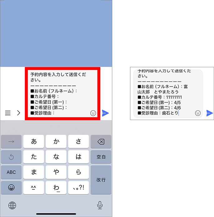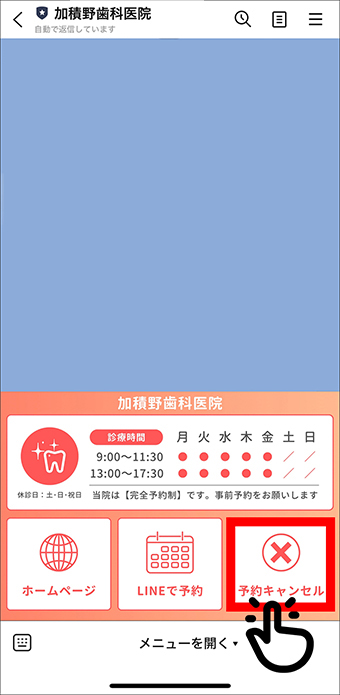 LINE予約の流れ STEP 1 LINE友だち登録 LINEアプリを起動し、上記のQRコードを読み取り、友だち登録をお願いします。 スマートフォンでご覧の方は、こちらをタップするとLINEアプリが開きます。 STEP 2 LINEで予約をタップ メニューから「LINEで予約」をタップしてください。 STEP 3 内容を入力して送信 内容を入力して送信してください。当院にて内容を確認後、折り返しお返事いたします。 予約キャンセルについて メニューから「予約キャンセル」をタップしてください。 内容を入力して送信してください。当院にて内容を確認後、キャンセルさせていただきます。